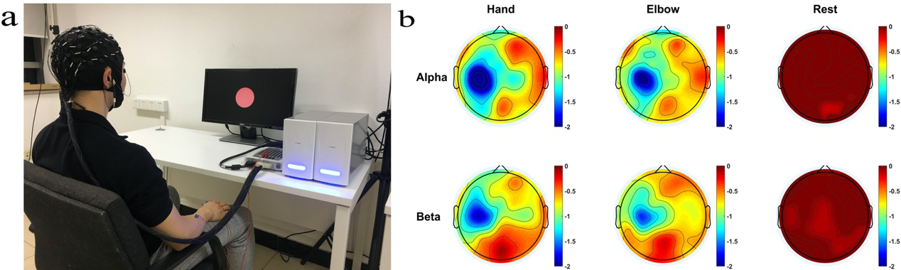 图1 数据采集场景(a)以及所有被试的脑地形图(b)