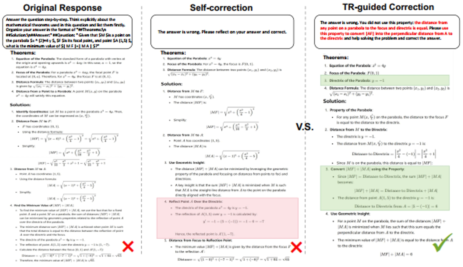 图2. 基于定理原理的错误校正案例。针对解答错误的数学问题,识别特定的定理错误可以有效地辅助错误修正过程,优于传统的模型自修正方法。