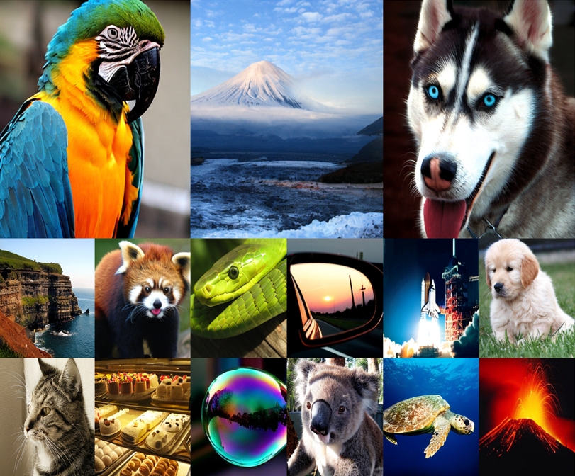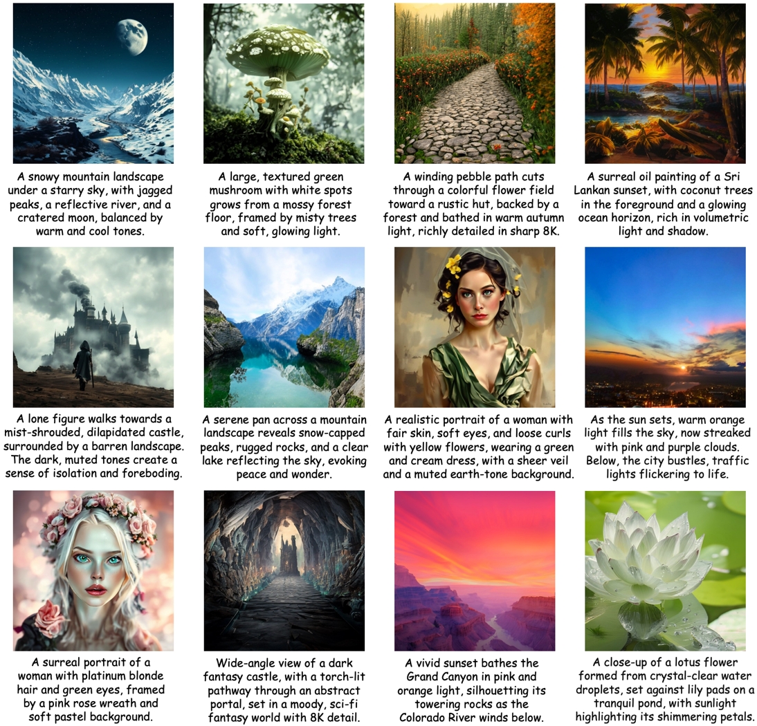 图2展示了我们采用ETT方法生成的视觉效果。这些图像均为512×512分辨率,覆盖了多种风格、主题和场景。图中的提示信息为简化版,用以概括图像的主要概念。