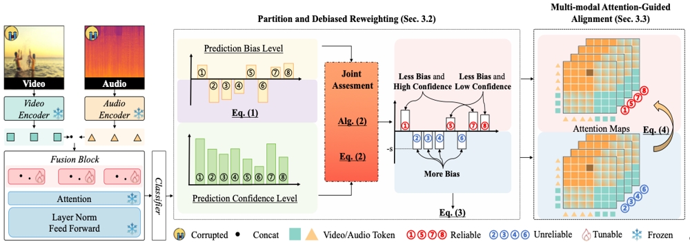 本文针对多模态任务在测试时遇到的多模态同时域偏移问题提出了Partition-Then-Adapt(PTA)方法。现有测试时自适应(TTA)技术多集中于单一模态的域偏移,当多模态同时受到干扰时,模型难以区分可靠样本,容易出现预测偏差并导致误差积累。PTA由两部分组成:一是“分区与去偏重加权”(Partition and Debiased Reweighting,PDR),通过比较样本预测标签频率与批次平均水平,量化预测偏差并将数据划分为潜在可靠和不可靠两类,再结合置信度用分位数方法重新加权。二是“多模态注意力引导对齐”(Attention-Guided Alignment,AGA),利用可靠样本的注意力分布引导不可靠样本,通过最大均值差异正则化使模型聚焦于语义相关线索。