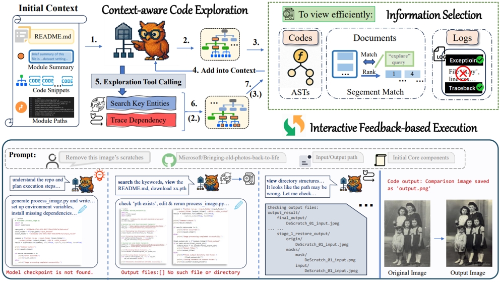 图2. RepoMaster 的自主探索–执行循环概览及示例演示。