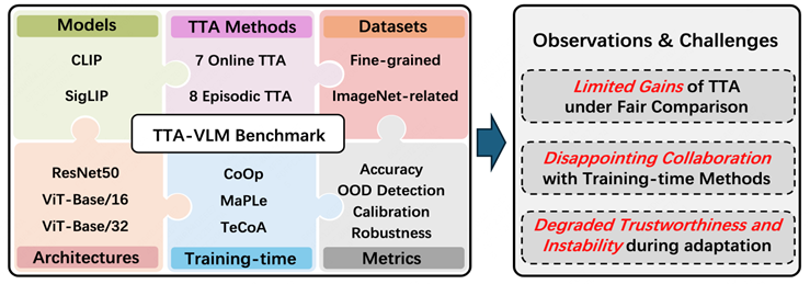 为此,我们提出了一个面向视觉语言模型的测试时适应综合评测基准——TTA-VLM。该基准在一个统一且可复现的框架中实现了8种片段式TTA方法和7种在线TTA方法,并在15个常用数据集上对其进行了系统评估。与以往仅关注CLIP的研究不同,我们将评估范围扩展至SigLIP模型,并引入训练时调优方法以检验TTA方法的通用性。除了分类准确率,TTA-VLM还整合了鲁棒性、校准性、分布外检测能力及稳定性等多种评估指标,从而能够对TTA方法进行更全面的评估。通过大量实验,我们发现现有TTA方法相比早期开创性工作带来的性能提升有限、当前TTA方法与训练时微调方法的协同效果不佳、准确率的提升常常以模型可信度的下降为代价。