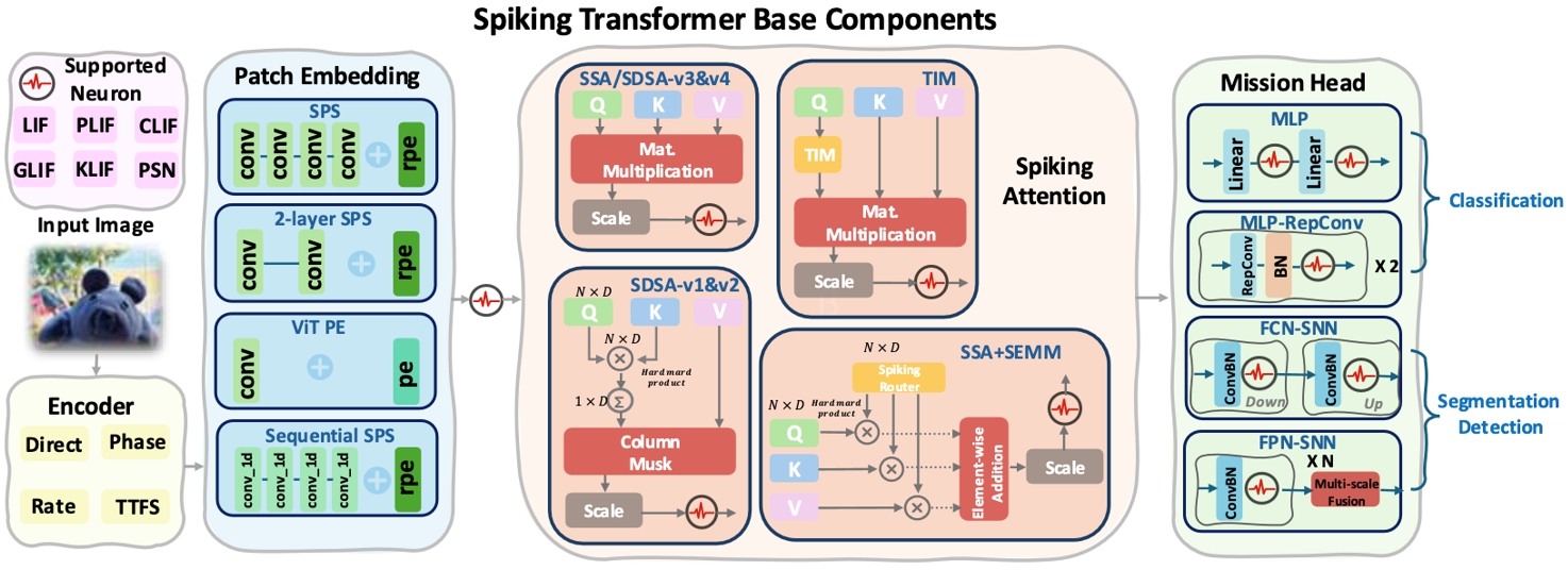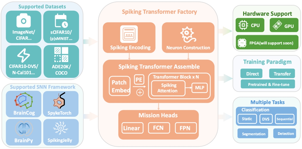 随着类脑智能的快速发展,脉冲神经网络凭借其稀疏性与事件驱动特性展现出突出的高能效优势。近年来,研究者提出了一系列Spiking Transformer模型。然而,该领域目前仍缺乏统一的实现与评测平台,导致实验结果难以复现,不同模型间的比较亦缺乏公平性。