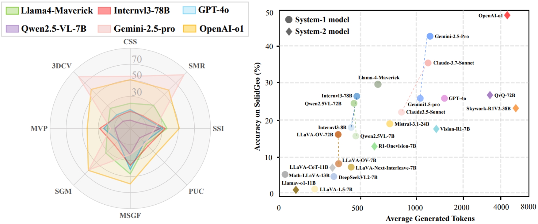 图1.左图为6个MLLM在SOLIDGEO基准上8个立体几何主题的表现;右图为25个 MLLM 的准确率与平均生成长度