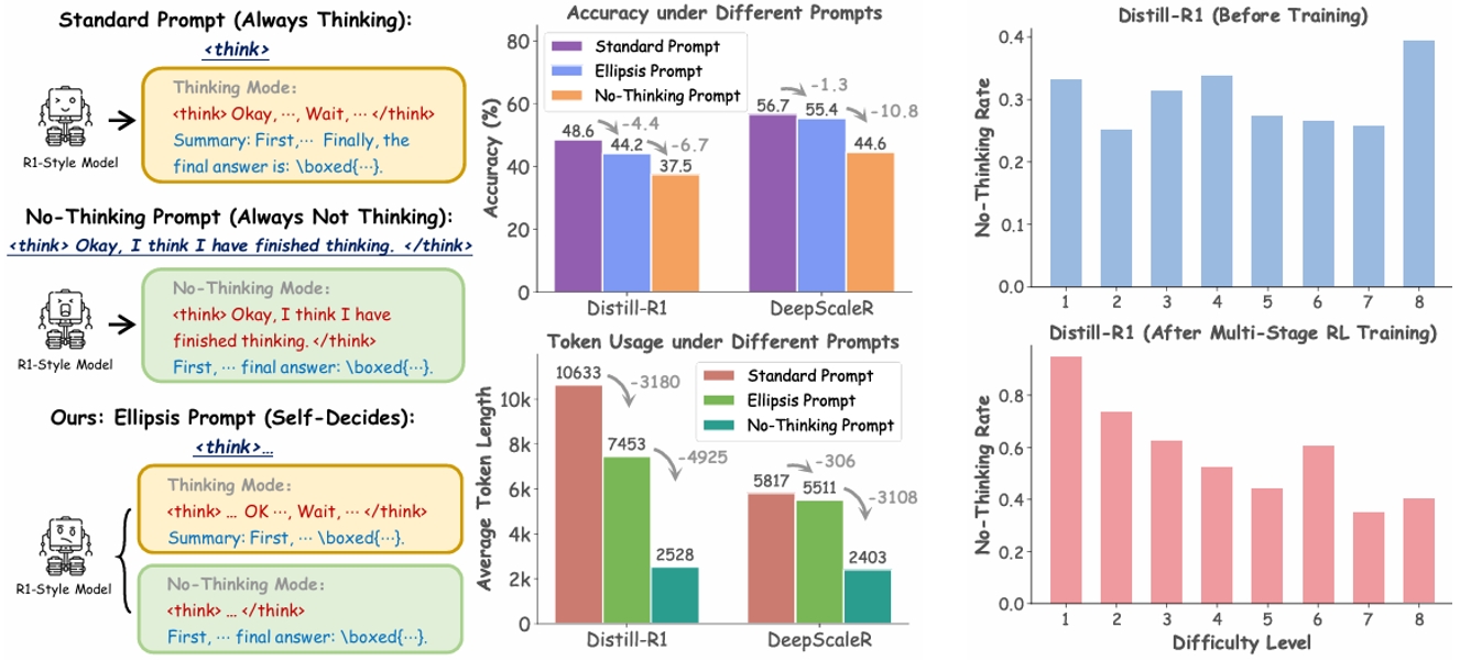左侧: 标准提示与省略号提示下的准确率和 Token 使用量; 右侧: 按难度划分的无思考行为比例