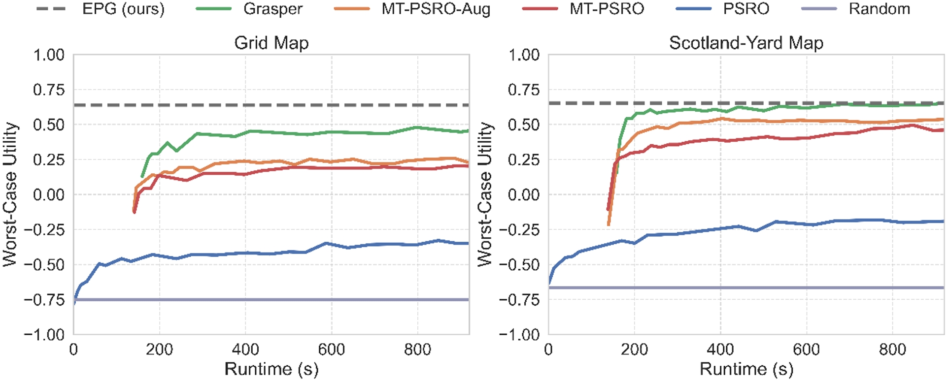 EPG框架的核心思想是在不同图结构下对抗各自的均衡对手策略进行强化学习,得到鲁棒的图网络泛化策略。本文首先设计了一种理论高效的动态规划算法作为均衡策略的生成器;为提升对追捕者数量的可扩展性,提出了分组机制与序贯模型以实现联合策略分解。实验表明,结合一种均衡引导机制以及适配跨图追逃策略训练的距离特征,EPG方法能在多种现实图结构下得到理想的零样本性能。对于多出口的追逃博弈,本文零样本泛化的实时追捕策略甚至能够达到或超越当前最优方法的微调策略性能。