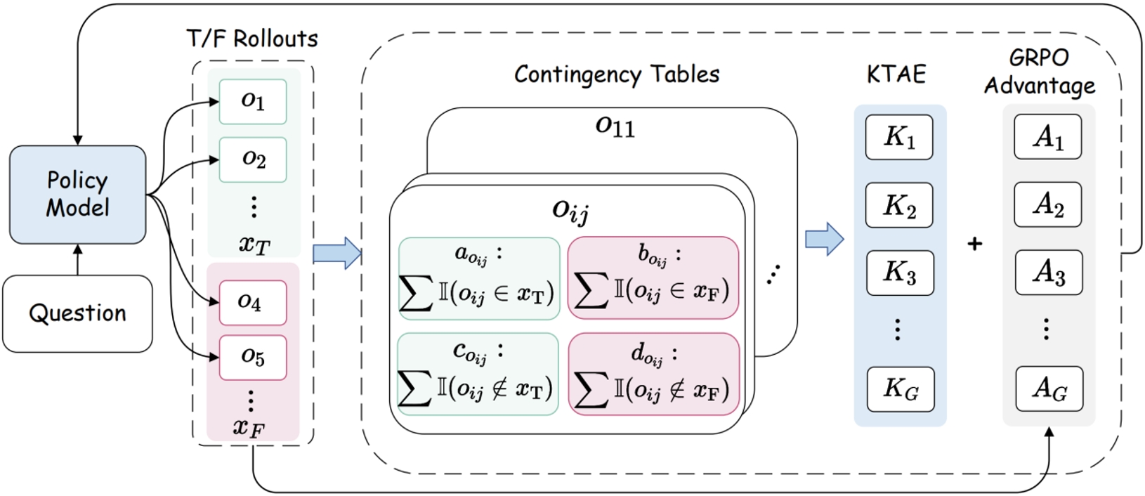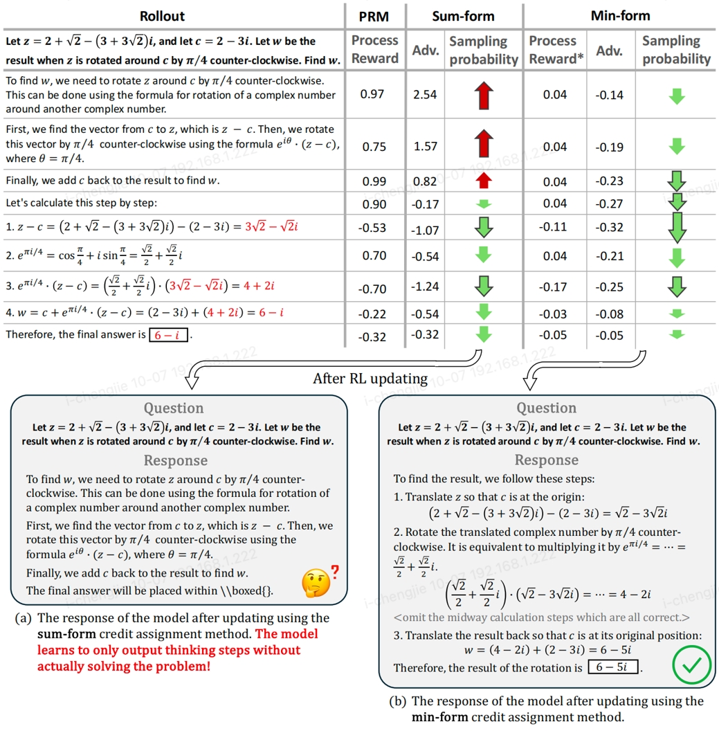 求和形式与最小形式信用分配的比较。推理过程 (rollout) 中错误的步骤以红色标出,PRM合理地为这些步骤分配了负分。箭头指示采样概率的变化,变化幅度较大的部分标注为带轮廓的箭头。求和形式信用分配导致破解高奖励步骤,而最小形式信用分配给出了更合理的采样概率变化幅度和方向。