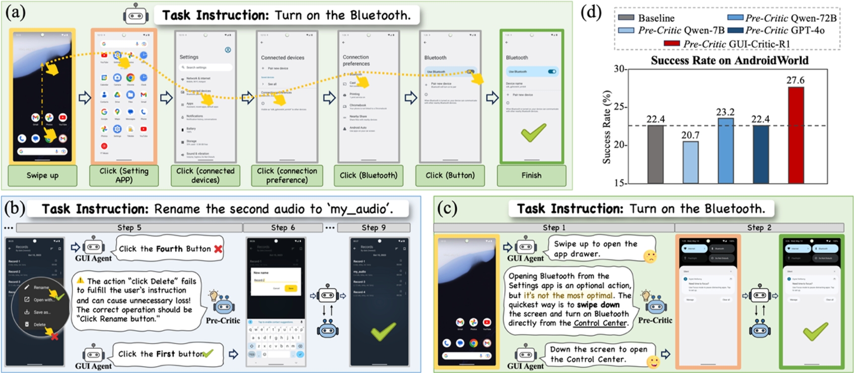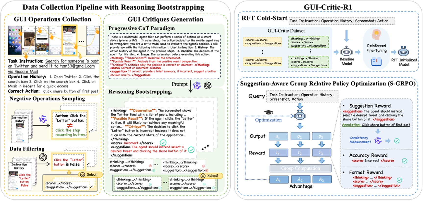 为解决这些问题,我们引入了一种操作前反思机制,通过推理潜在结果和行为正确性,在实际执行前提供有效反馈。具体而言,我们提出了一种建议感知群组相对策略优化(S-GRPO)策略,以构建预操作评判模型GUI-Critic-R1,并整合了新颖的建议奖励机制,以增强模型反馈的可靠性。此外,我们开发了一个基于推理引导的数据采集链路,创建了训练集和测试集,填补了现有GUI评判数据的空白。在移动端和网页端跨域的GUI-Critic-Test静态实验中,我们的GUI-Critic-R1在评判准确性方面展现出显著优势。在GUI自动化基准测试的动态评估中,我们的模型通过提高成功率和操作效率,进一步凸显了其有效性和卓越性。