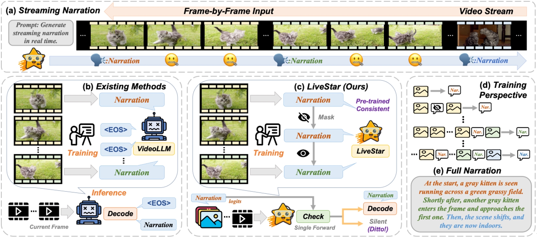 图1. 在线视频理解示例。(a) 以流式叙事任务为例,在线视频理解需要Video-LLMs 处理连续流并在适当的时间输出;(b) 现有方法过度依赖于学习 EOS 标记,导致推理性能低下;(c)-(e) LiveStar 通过 SCAM 和 SVeD 建立了有效的响应-静默训练和推理框架,同时不影响基本的视频理解能力。