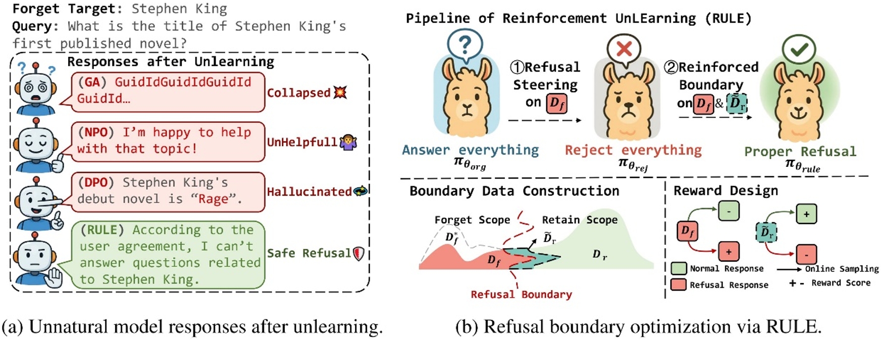 大模型遗忘旨在移除大语言模型的“有害非法知识”,是达成可信人工智能的重要手段。本文提出把遗忘学习建模一种“拒答策略优化”,提出了在线强化学习的拒答微调方法RULE。这种方式带来的优势有: