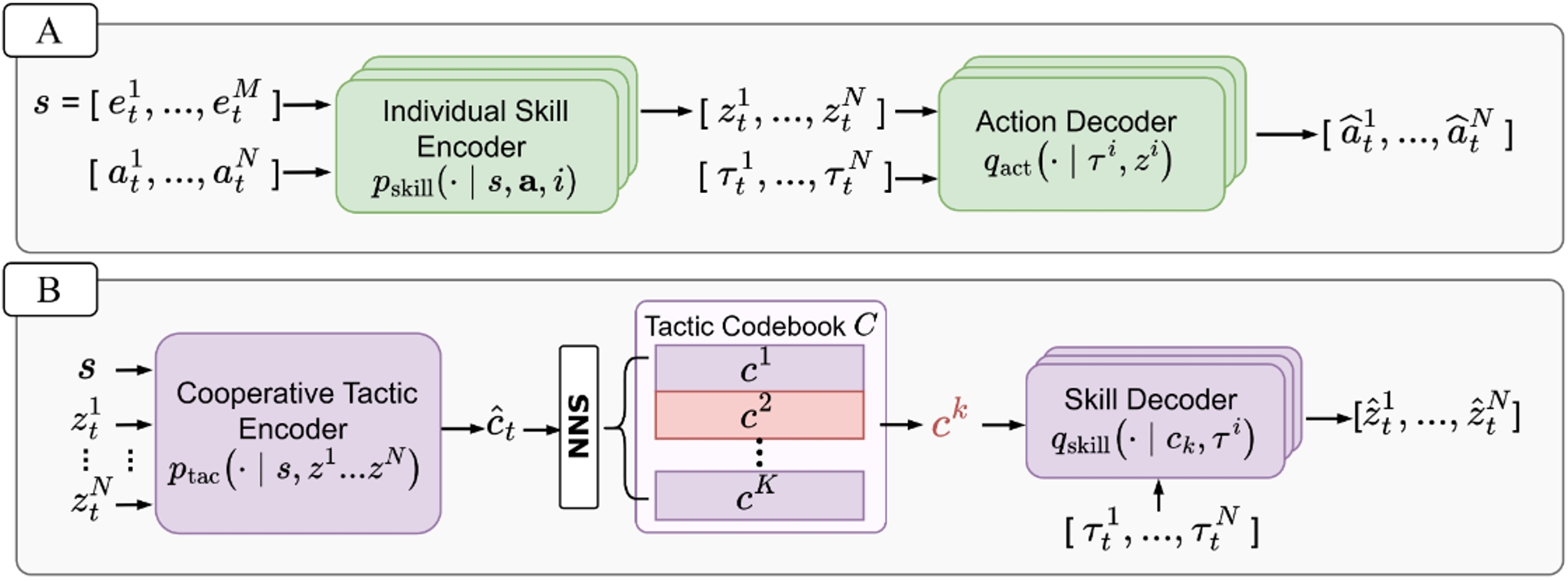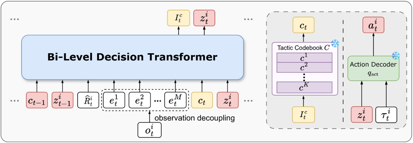 为此,我们提出了一种双层知识迁移方法,在个体和团队两个层面进行知识传递:个体层面提取可迁移的 individual skill,团队层面将Individual skill 组合映射为战术并构建战术 codebook。通过双层决策机制,我们同时融合技能和战术,引导智能体在新任务中做更优决策。我们设计了 Bi-level Decision Transformer 进行策略决策。大量在 SMAC 和 MPE 基准上的实验结果表明,我们在未见过的任务上也展现出很强的泛化能力。