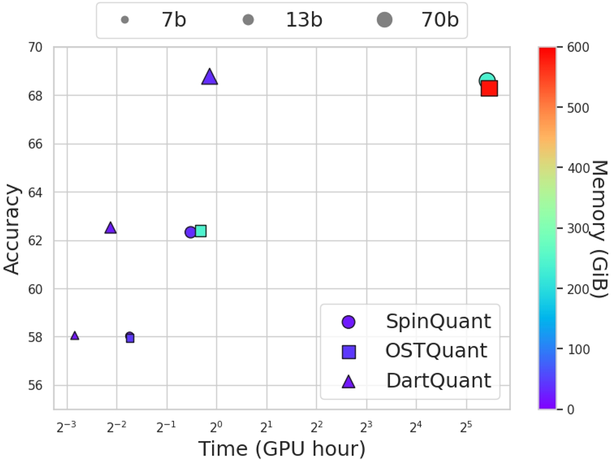 图1.不同旋转优化方法的计算成本比较。DartQuant在对不同大小模型的量化中,均以极短的时间获得了最优的性能。