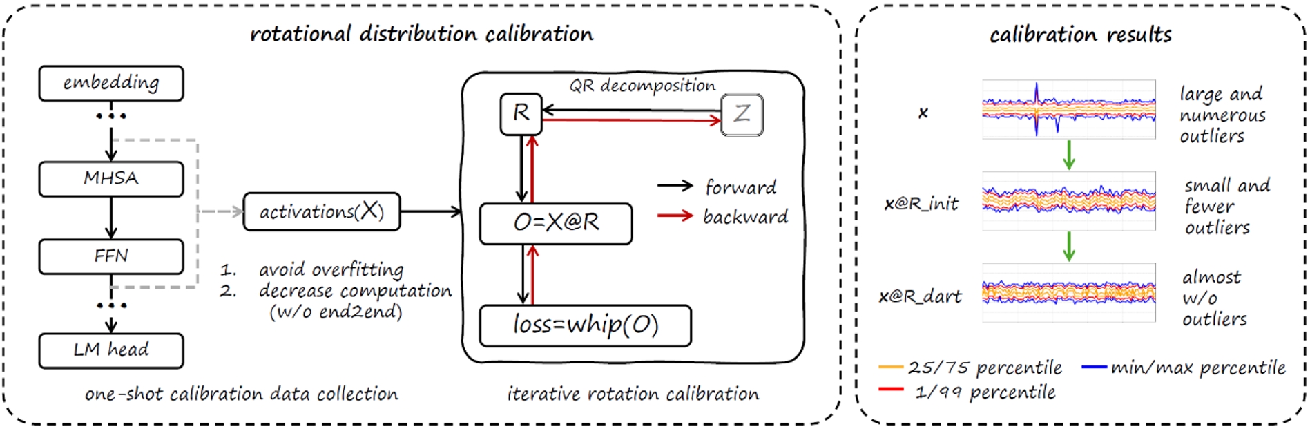 为了应对这一挑战,我们提出了一种高效的分布感知旋转校准方法 DartQuant,它通过约束旋转后激活的分布来降低旋转优化的复杂度。该方法还有效地减少了对特定任务损失函数的依赖,从而降低了过拟合的风险。此外,我们引入了 QR-Orth 优化方案,用更高效的解决方案取代了昂贵的正交流形优化。在各种模型量化实验中,DartQuant 展现了卓越的性能。与现有方法相比,它在 70B 模型上实现了 47 倍的加速和 10 倍的内存节省。此外,它首次在单个 3090 GPU 上成功完成 70B 模型的旋转校准,使得在资源受限的环境中实现大型语言模型的量化成为可能。