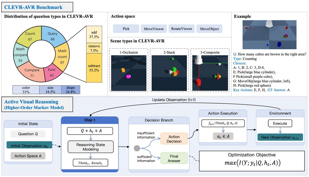 上方:CLEVR-AVR 模拟器基准(CLEVR-AVR Simulator Benchmark),展示了问题类型、动作空间、场景及示例的分布情况。下方:用于主动视觉推理(Active Visual Reasoning, AVR)的高阶马尔可夫决策过程(Higher-order Markov Decision Process, MDP)范式。