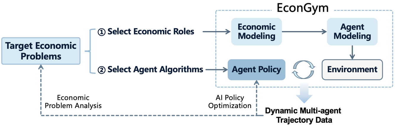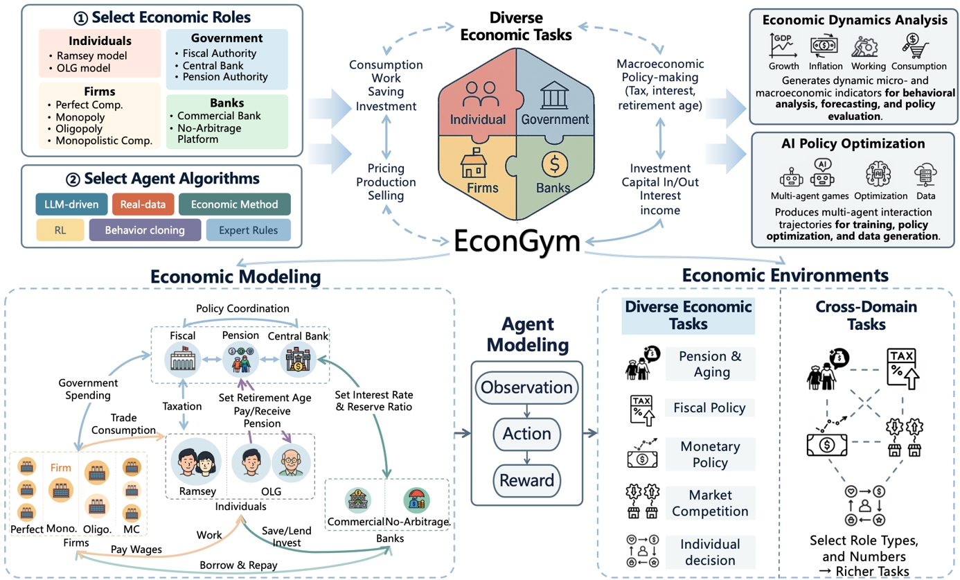 为弥补这一空白,我们提出 EconGym——一个可扩展、模块化的测试平台,用于连接多样化的经济任务与 AI 算法。EconGym 基于严格的经济建模方法,构建了 11 种异质化角色类型(如家庭、企业、银行、政府)、对应交互机制,以及具备清晰观测、动作和奖励定义的智能体模型。用户可灵活组合经济角色与不同智能体算法,从而在 25+ 经济任务中模拟丰富的多智能体轨迹,支持基于 AI 的政策学习与分析。实验结果表明,EconGym 能够支撑多样化与跨领域的任务——例如财政、养老与货币政策的协同模拟——并实现 AI 方法、经济学方法及其混合方法之间的对比评测。结果显示,任务组合与算法多样性能够有效拓展政策空间,而在复杂环境中,结合经典经济学方法的 AI 智能体表现最佳。此外,EconGym 可扩展至 1 万个智能体规模,在保证高真实感的同时保持高效性。