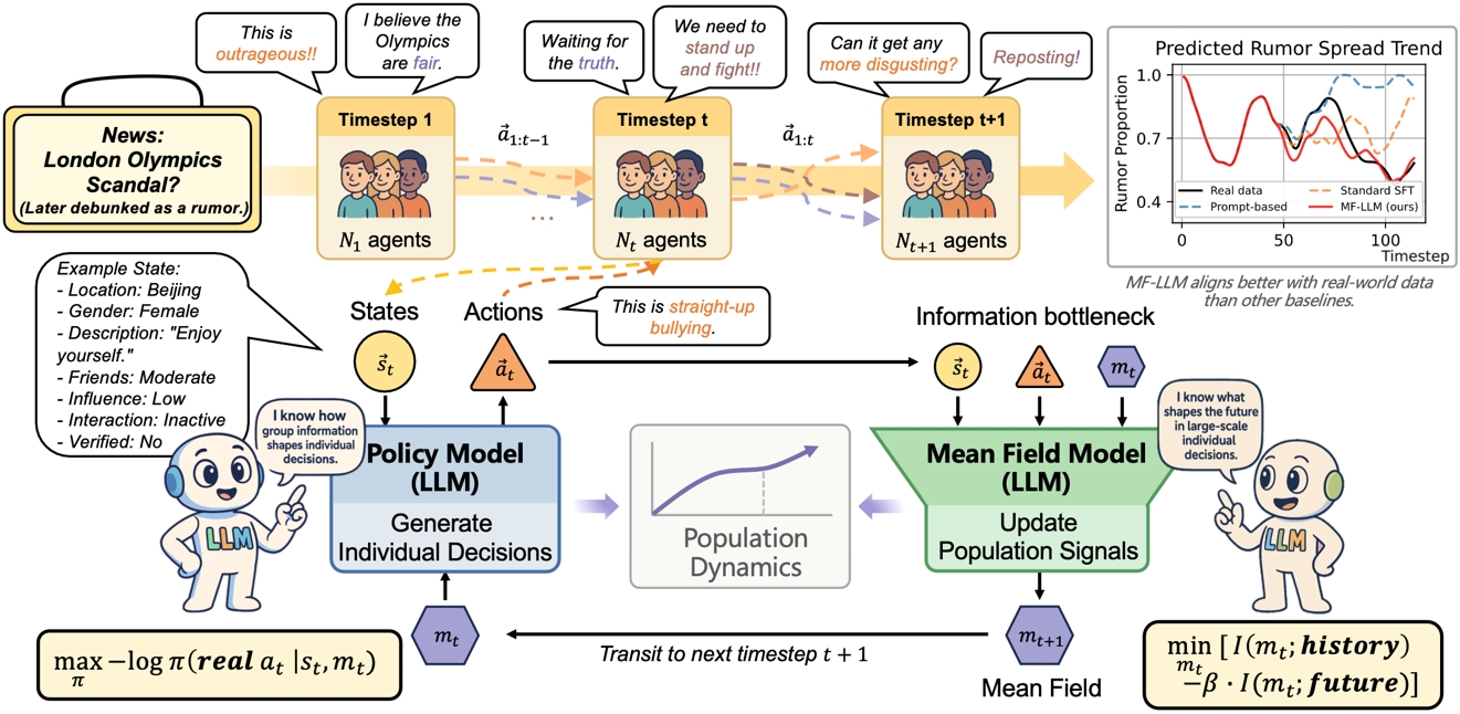 为此,我们提出 MF-LLM 框架,首次将均值场理论引入 LLM 驱动的社会模拟。该框架通过迭代建模个体与总体之间的双向作用:总体信号引导个体决策,个体行为反过来更新总体信号,从而形成连贯的群体动态轨迹。同时,我们设计了 IB-Tune 方法。该方法受信息瓶颈原理启发,能够有效保留对未来最具预测力的总体信号,并过滤冗余历史信息,从而显著提升模型与真实社会数据的对齐度。实证结果显示,MF-LLM 在真实社会数据集上相较于非均值场基线模型将 KL 散度降低 47%,显著增强了趋势预测与干预规划的精度。跨 7 个应用领域与 4 种 LLM 框架的验证进一步证明,MF-LLM 为社会模拟提供了一种 可扩展且高保真的新范式。