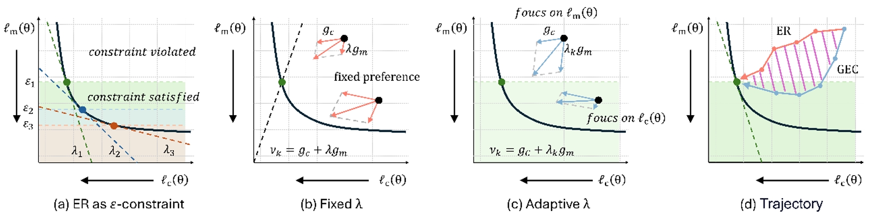 图1. GEC方法与传统ER方法的区别:ER使用固定权重策略,GEC采取自适应权重策略