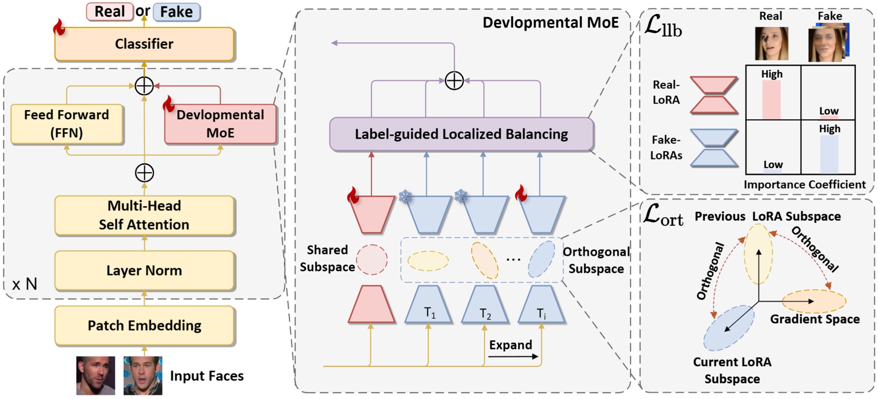左:可增长的混合专家模型框架,使用一个共享专家和一个正交专家序列,互补地建模伪造类型知识并保留真是人脸的共性。右上:标签引导的局部平衡策略,动态分配专家完成不同建模任务。右下:融合正交梯度的正交损失。