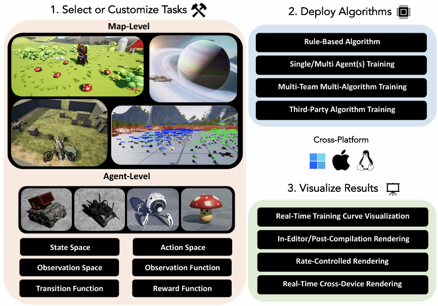 图1. Unreal-MAP的研究工作流程:针对新手用户,该平台提供对内置任务的直接访问权限,并配备完善的算法部署功能及可视化能力;针对高级用户,Unreal-MAP支持用户修改现有内置任务或自主开发新任务框架,从而验证其研究设想。平台兼容各种算法和算力设备,可实现虚幻端渲染、打包文件渲染以及跨设备训练+实时渲染。