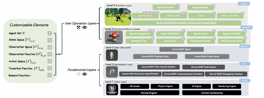 图2. Unreal-MAP的架构设计: 该平台采用层次化五层架构设计,全部功能模块均开源。用户可仅通过Python接口层配置参数,对POMG框架内的所有要素进行编辑修改;对于更复杂的开发需求,用户可借助高级模块层的蓝图系统(Blueprint)灵活调整场景要素。