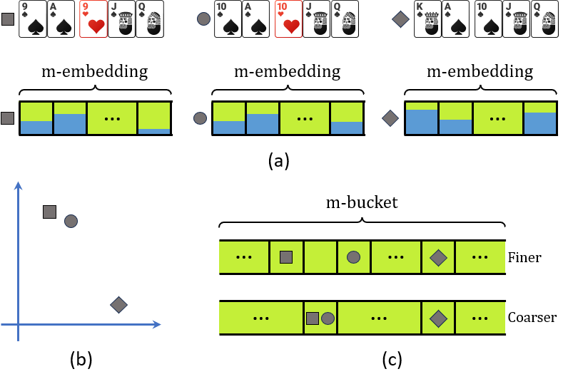 图 1 德州扑克中手牌■、●、◆(表征信息集)在Embedding CFR与传统信息集约简下的表征行为对比:(a)Embedding CFR将信息集映射为嵌入坐标,该坐标构成m维概率分布,且所有维度的数值之和为1;(b)嵌入坐标的二维投影展示了手牌间的几何拓扑关系,既突出了相似性(■与●之间的近距离),也体现了差异性(与◆的远距离);(c)传统约简方法将信息集映射固定数量(如m个)的约简等价类中,迫使信息集在分类时面临二元选择:以■、●为例,要么将二者细分到不同等价类,要么将二者合并到同一类。这种缺乏中间状态的特性,阻碍了利用信息集间的相似性辅助策略求解的可能。