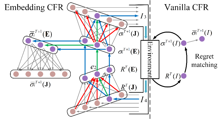高质量信息集约简仍是求解大规模不完美信息扩展型博弈(如无限制德州扑克)的核心挑战 —— 此类博弈中,空间计算资源的有限性阻碍了全博弈层面的策略求解。当前主流人工智能方法依赖预训练离散聚类实现约简,但这种硬分类会不可逆地丢失关键信息:具体而言,信息集之间可量化的细微差异(这对策略求解至关重要),进而影响求解质量。受自然语言处理中词嵌入范式的启发,本文提出嵌入 CFR 算法(Embedding CFR),一种在嵌入空间中求解不完美信息扩展型博弈策略的新方法。该算法通过预训练将孤立信息集的特征嵌入到相互关联的低维连续空间中,生成的向量能更精准地捕捉信息集之间的差异与关联。嵌入 CFR 在该嵌入空间内,以遗憾累积和策略更新为核心驱动策略求解过程,相关理论分析验证了其降低累积遗憾的能力。在德州扑克的变体实验环境中的验证表明,在相同空间开销下,与基于聚类的约简算法相比,经嵌入 CFR 求解的策略可利用度下降速度显著更快,证实了算法的有效性。嵌入CFR是首个在扑克人工智能中通过低维嵌入预训练信息集约简以实现策略求解的算法。