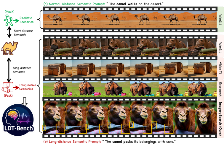 ImagerySearch 的动机。该图展示了两个与骆驼相关的语义依赖场景。左:距离表示在去噪过程中提示词元的相应作用强度。LDT-Bench 由具有长距离语义的想象场景构成,其语义依赖通常较弱。右:Wan2.1 在短距离语义下表现良好,但在长距离语义下失效。测试时缩放方法(如 Video T1(Liu et al.,2025a)、Evosearch(He et al.,2025a))同样表现乏力。然而,ImagerySearch 能生成连贯且具备上下文感知的动作(橙色框)。