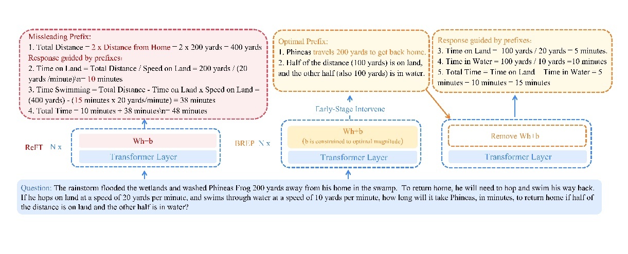 本研究在解决表示微调方法在应用于大型语言模型进行数学推理时性能显著下降的问题。作为一种比参数高效微调更高效的技术,表示微调通过直接优化模型内部表征而非调整权重来适应新任务,但在数学领域表现不佳。通过诊断分析发现,其性能瓶颈主要源于两大原因:一是模型在推理初期难以生成有效的“推理前缀”,导致解题思路存在误导;二是表示微调的干预向量会干扰模型对数字的基础编码,这种错误会在后续的“思维链”生成中不断累积,最终导致计算失败。为应对这些挑战,本文提出了一种名为“偏差约束前缀表示微调”的新方法。该方法通过前缀训练与早期干预策略,使模型专注于学习生成高质量的初始推理步骤,并仅在早期进行干预以避免误差扩散。同时,通过“偏差约束训练”对干预向量的幅度进行约束,确保在有效引导推理的同时不破坏底层的数值表征。在多种模型架构上的大量实验证明该方法的有效性和通用性,显著提升了大型语言模型在数学推理任务上的表现。