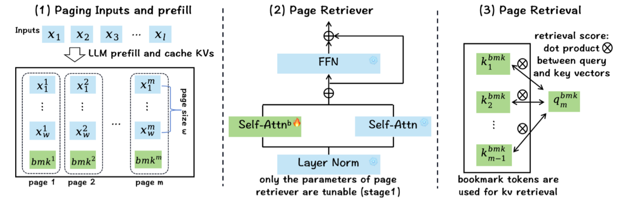 与在原始文本层面进行检索的传统RAG方法不同,RetroLM创新地在模型的键值(Key-Value,KV)缓存层面进行操作。它将KV缓存划分为连续的“页面”,并设计了一个专门的可训练“页面检索器”,以在推理过程中精确、动态地识别并检索出最关键的KV页面用于注意力计算。该框架通过高效的两阶段训练策略进行优化:首先训练检索器,然后对模型进行后训练以适应稀疏的KV上下文。