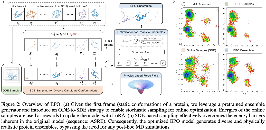 (a)EPO流程示意图。(b) 序列ASRE的势能面示意图。通过SDE在线采样实现对构象空间的多样性探索,通过基于能量偏好的微调实现与热力学分布的对齐。