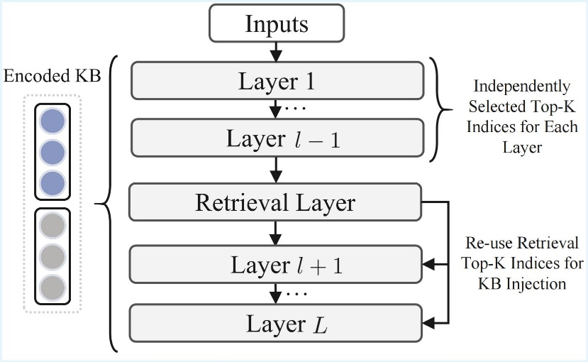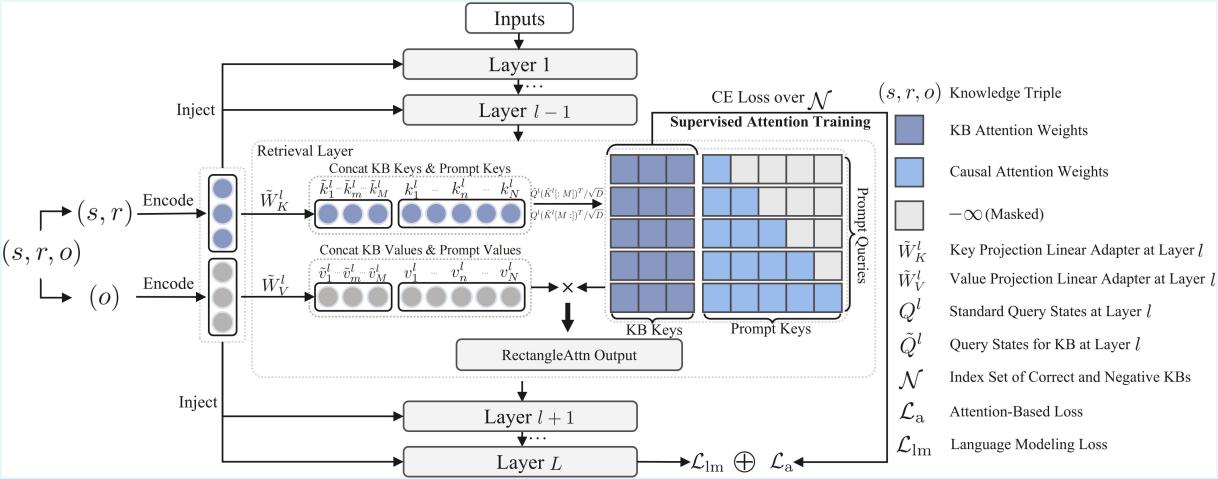 本文提出了一种名为SR-KI的创新方法,用于将实时、大规模的结构化知识库(KBs)高效地融入大语言模型(LLMs)中。SR-KI首先通过预训练编码器将知识库编码为键值对(key-value pairs),并注入模型的KV 缓存(KV cache)。在此基础上,SR-KI采用了两阶段训练范式:第一阶段定位模型内部的专属“检索层”(retrieval layer),第二阶段在该层施加基于注意力的监督损失,显式引导模型聚焦于相关知识条目。与传统依赖外部检索器和多阶段工作流的检索增强生成方法不同,SR-KI实现了端到端推理,在模型的潜在空间中直接完成知识检索。这一设计不仅提升了知识压缩与利用效率,还支持动态知识更新。实验结果显示,SR-KI可在单张A100 40GB GPU上为7B参数模型注入多达4万条知识库条目,在最佳任务上实现超过98% Recall@10,平均性能超过88%。在问答和知识标识生成任务中,SR-KI 同样保持了卓越表现,同时实现了高达 99.75% 的知识压缩率。
