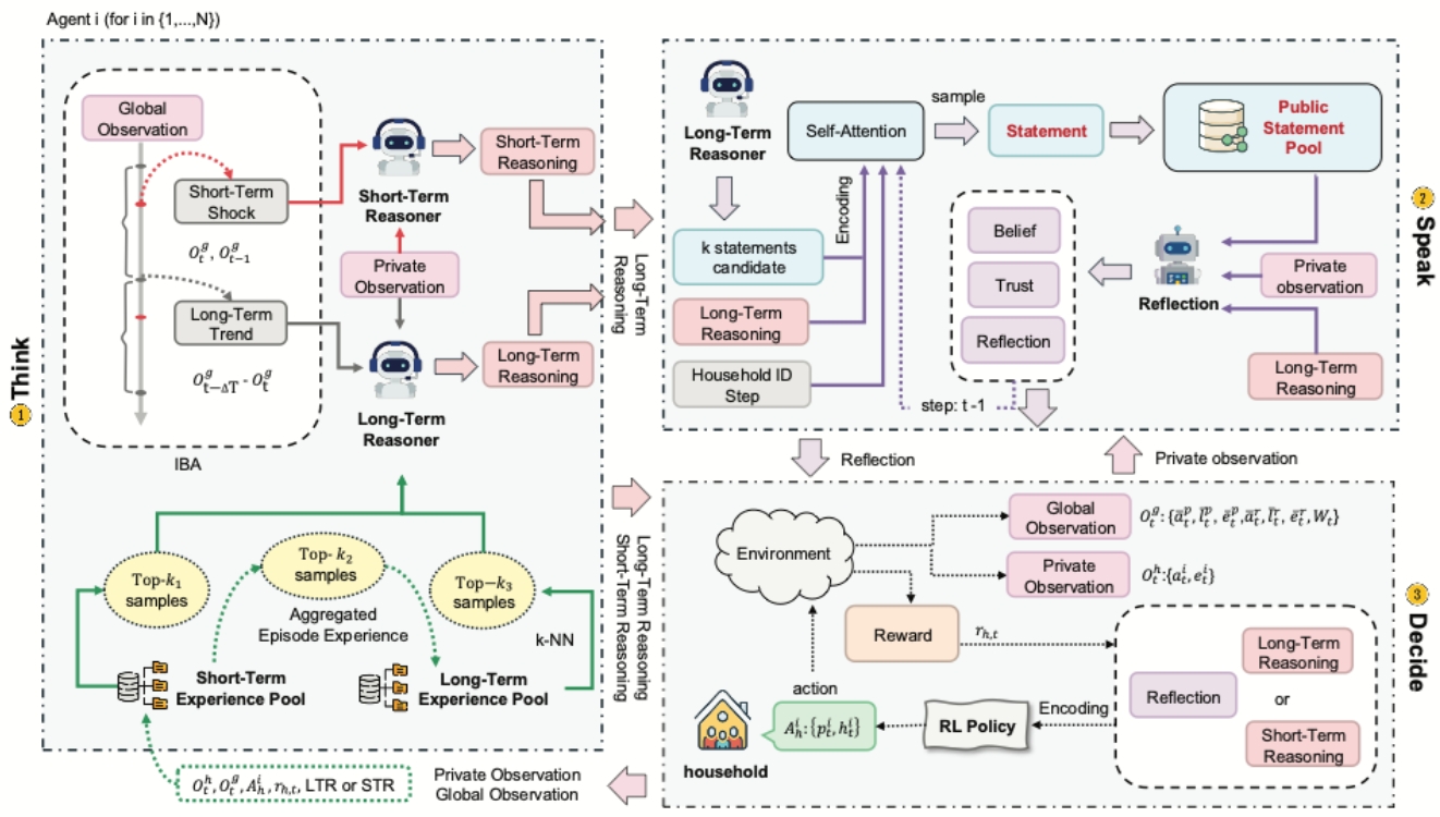 LAMP 的工作流程:(a)双路径的思考模块将长期趋势和短期冲击提取为紧凑的推理嵌入;(b)表达模块通过自注意力机制抽样并广播一条消息,并通过反思步骤来更新信念;(c)决策模块的策略网络将数值观测与语言嵌入和反思嵌入拼接起来,从而选择动作。