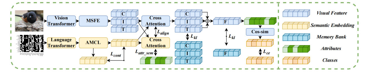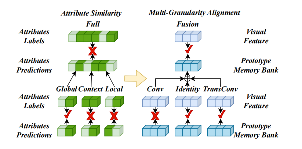 图1. 零样本学习中的属性被划分为全局属性、上下文属性与局部属性三个子集(左)。其中,勾号表示预测属性与真实标签匹配,叉号表示不匹配。三个多尺度视觉分支分别与相应的属性子集对齐,它们的融合结果用于预测完整的属性向量(右)。此处的勾号代表施加KL散度惩罚,叉号则代表不施加。