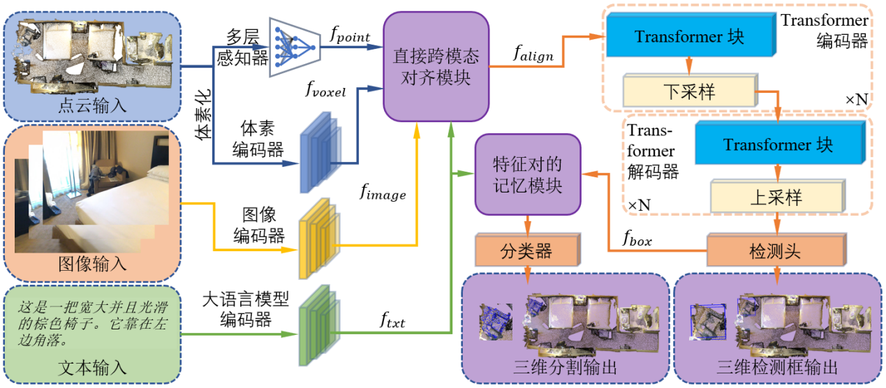 提出网络的总体结构示意图。给定点云、图像和文本输入后,点云首先被体素化。随后,我们分别通过 MLP、体素编码器、图像编码器和大型语言模型(LLM)编码器提取四种不同的特征表示。这些异构特征经由我们提出的直接跨模态对齐模块进行统一,生成对齐特征。接着,对齐特征通过多层 Transformer 编码-解码结构进行进一步特征细化。随后,检测头生成候选框预测,并在每个检测区域内提取点级特征。将其与文本查询特征共同输入到所提出的记忆模块中,该模块利用存储的跨模态映射作为先验知识进行特征增强。最后,额外的分类器对融合后的特征进行处理,输出基于查询驱动的三维分割结果。