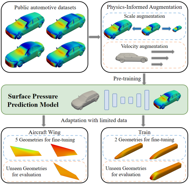 本文提出了一种名为 AdaField 的自适应场学习框架,旨在解决空气动力学子领域中数据稀缺的难题。深度学习模型在数据充足的空气动力学领域,如汽车,表现良好,但在数据稀缺的领域(如列车、飞机)泛化能力差,且不同数据在几何尺度和流动条件上存在显著差异,进一步阻碍了模型通用性。AdaField 在大规模公共数据集上进行预训练,并能有效地迁移到数据受限的子领域。其包含三个关键组件: