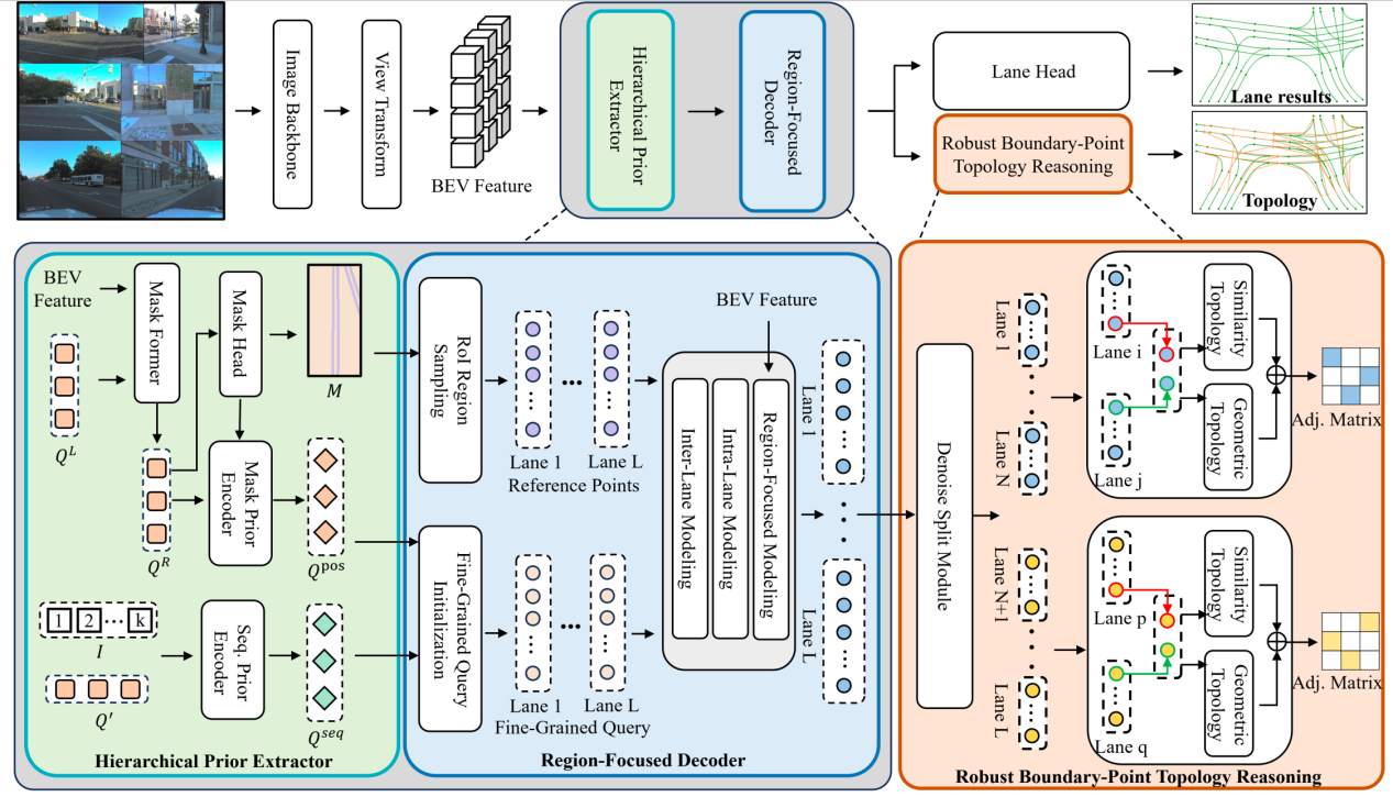 方法框架图,包括:层次先验提取器、区域聚焦解码器和鲁棒边界点拓扑推理模块