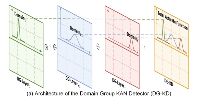 (1)域增量分组KAN检测器 (DG-KD):该检测器创新地使用域特定的径向基函数(RBFs)组合来构建激活函数。这使其在能够拟合高维图像输入的同时,保留了连续学习所必需的局部性和局部可塑性。