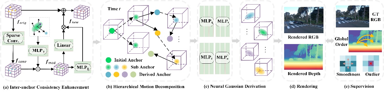 本研究针对自动驾驶场景中车道拓扑推理(Lane Topology Reasoning)这一关键问题展开,旨在提升车辆对复杂道路场景的拓扑推理能力。车道拓扑推理需要检测车道中心线与交通要素,并推断它们之间的拓扑关系,如车道连通性及与交通要素的关联。传统方法依赖繁琐的手工规则与后处理步骤,难以在复杂环境中保持稳定性能和泛化能力。近年来,端到端的统一框架逐渐成为主流,通过将车道与交通要素的检测及其关系推理整合为单一任务,实现整体优化。现有研究如 TopoNet 与 TopoLogic 等通常将每条车道视为一个整体实例(instance-level)进行建模,用单一查询(query)预测整条车道的关键点及其与其他车道的关系。然而,这种实例级表征难以较好地表达形状复杂、局部变化显著的车道。为此,本文提出 TopoFG,从细粒度层面建模车道结构。TopoFG 将每条车道表示为一系列细粒度查询(fine-grained queries),精准捕捉局部几何变化和结构细节。在此细粒度表征的基础上,进一步引入层次先验提取器、区域聚焦解码器及鲁棒边界点拓扑推理模块,以联合实现车道拓扑关系的推断。其中,边界点推理模块通过对车道起止点查询建模确定连通关系,并采用去噪机制增强结果的稳健性。