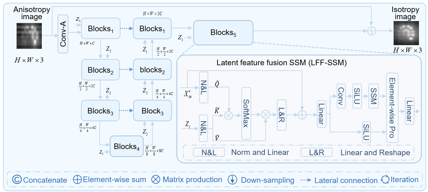 为解决这一难题,本研究历时三年,设计并构建了一个真实世界MPI各向异性图像数据集,涵盖多种灵敏度、分辨率、血管及形状的数据。在此基础上,提出了一种基于Mamba架构的新方法—MPI-Mamba(如图1所示),用于各向异性图像校准。该方法创新性地设计了潜特征融合状态空间模型模块,实现多尺度特征的充分融合,并引入条件潜扩散模型分支,在高度压缩的潜空间中提取图像特征,有效指导校准和去模糊过程。实验结果显示,MPI-Mamba在模拟数据和真实世界MPI数据集上的表现均优于现有方法,显著提升了各向异性图像的校准与去模糊效果。