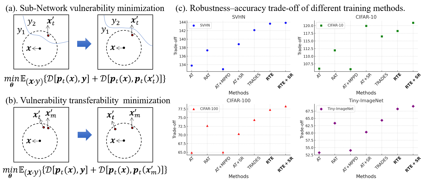 (a)子网络的脆弱性由其对最敏感输入扰动的反应所刻画。(b)最小化脆弱性在时间维度上的可迁移性,可以减少子网络间的共同弱点,从而提升整体集成鲁棒性。(c)不同训练方法得到的鲁棒性-准确率权衡效果,RTE在更困难的数据集上表现显著更好。
