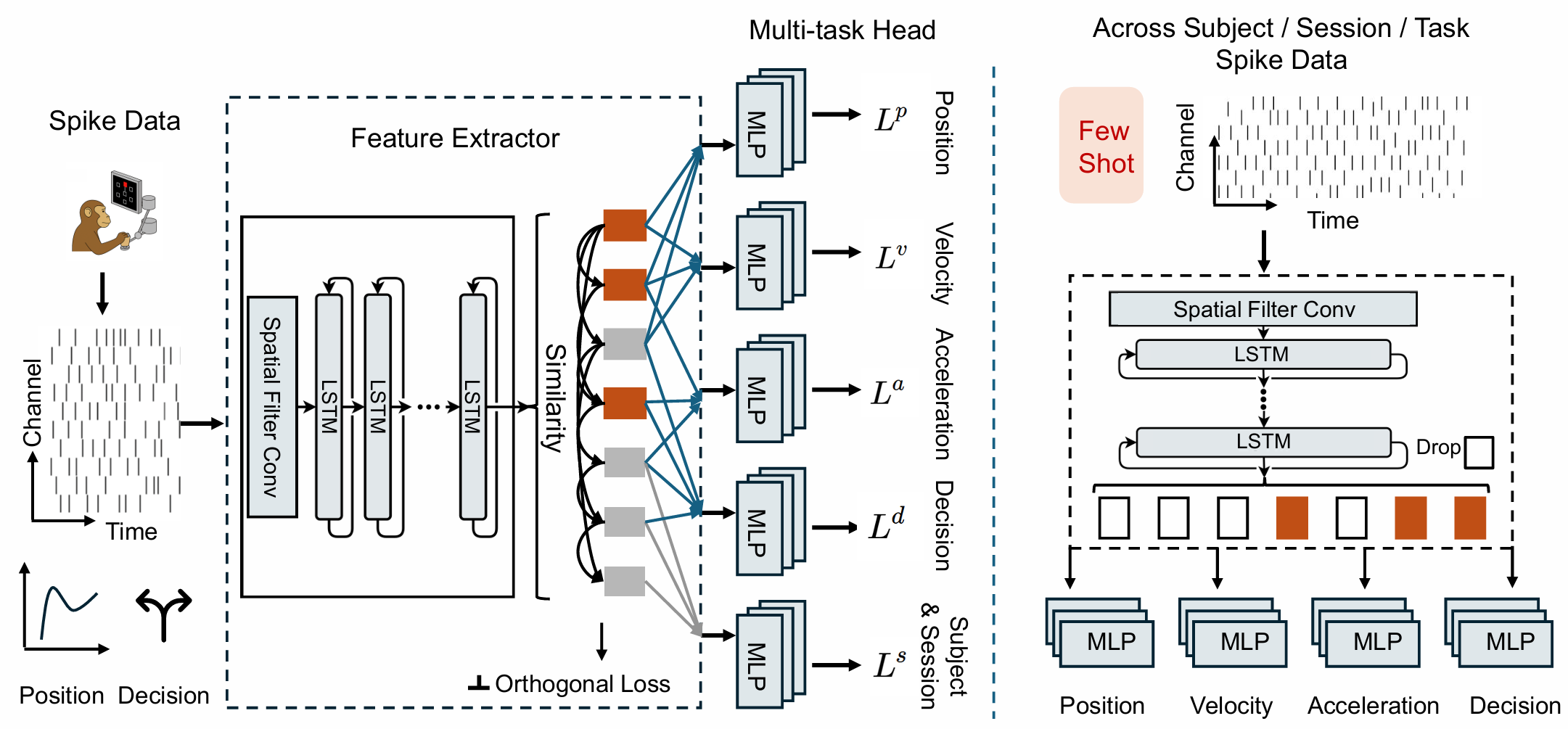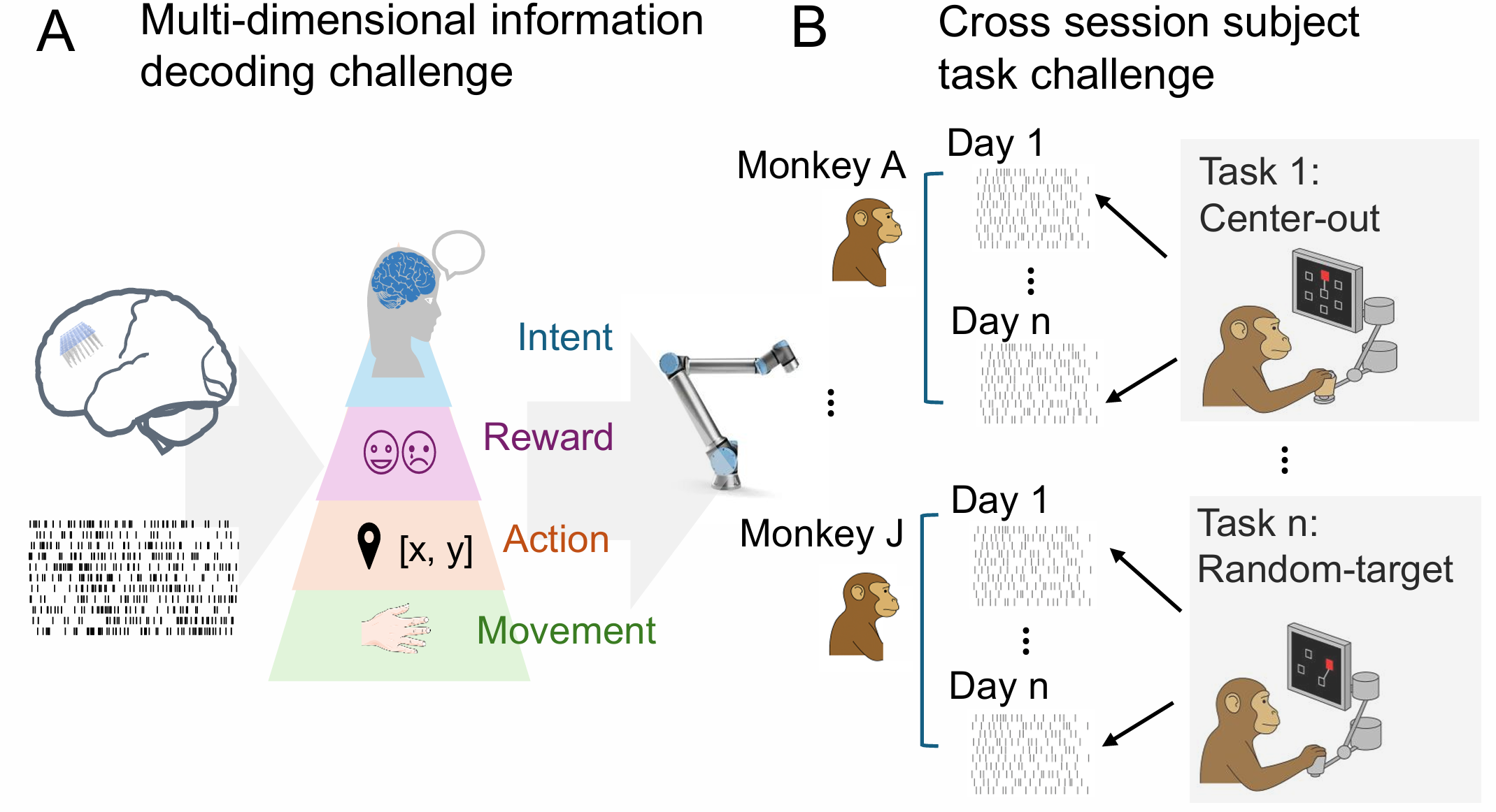 图1.多维神经解码中的关键挑战。(A) 对多样化神经信号并行解码的需求不断增长。(B) 在跨会话、被试和任务的分布偏移下泛化能力有限。