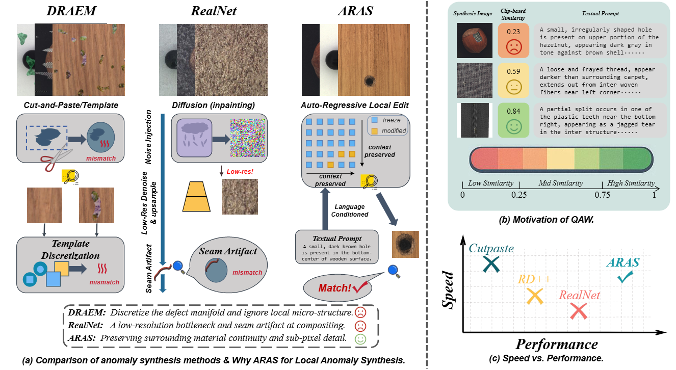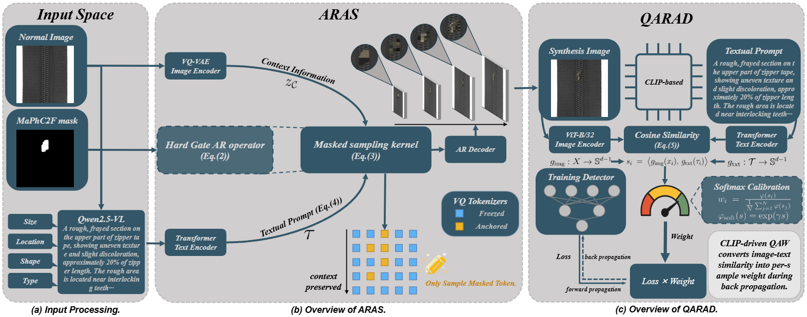 工业异常检测普遍受制于异常样本稀缺与分布差异,现有扩散/粗修补管线在低分辨去噪、语义可控性与生成成本上存在低分辨率瓶颈/边界缝隙、语义可控性差、训练等权导致劣质合成干扰优化等问题。为此,我们提出了一套“可控合成 × 质量自适应学习”的闭环解决方案:其一,ARAS(语言条件、掩码局部的自回归编辑器)在VQ-VAE离散token空间施加Hard-Gate算子,仅重写掩码内token、冻结上下文,从而保持材质微结构与相位连续,并以自然语言精确控制缺陷的类型/形状/尺度/位置;其二,QAW(质量感知重加权)将CLIP图文一致性映射为样本级连续权重,在不丢弃数据多样性的前提下降低训练方差、抑制低质合成对优化的干扰。