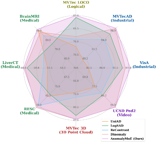 图1. AnomalyMoE 与现有异常方法在不同领域数据集上的性能对比