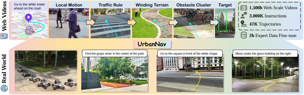 图1. UrbanNav总览。从海量网络步行视频中构建大规模语言-轨迹数据集,训练出能理解复杂自然语言指令的导航策略,仅需少量真实场景数据微调即可实现在未知城市环境中的视觉语言导航。