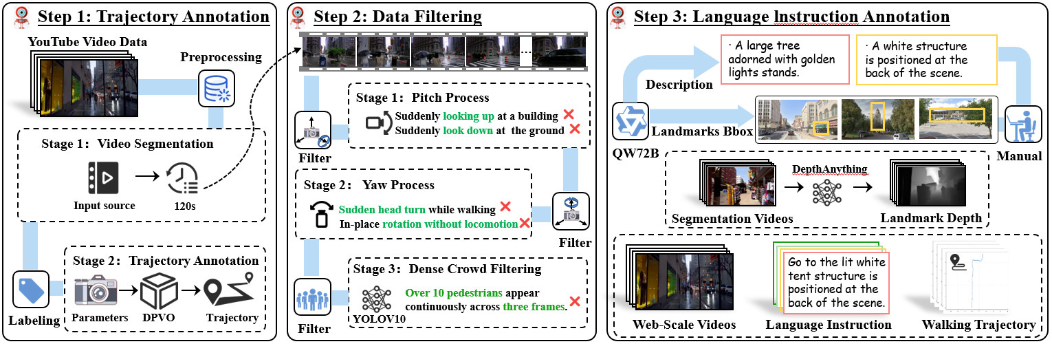 图2. UrbanNav数据构建流程。包括三个关键步骤:1)相机位姿估计;2)机器人兼容性过滤;3)语言指令生成。