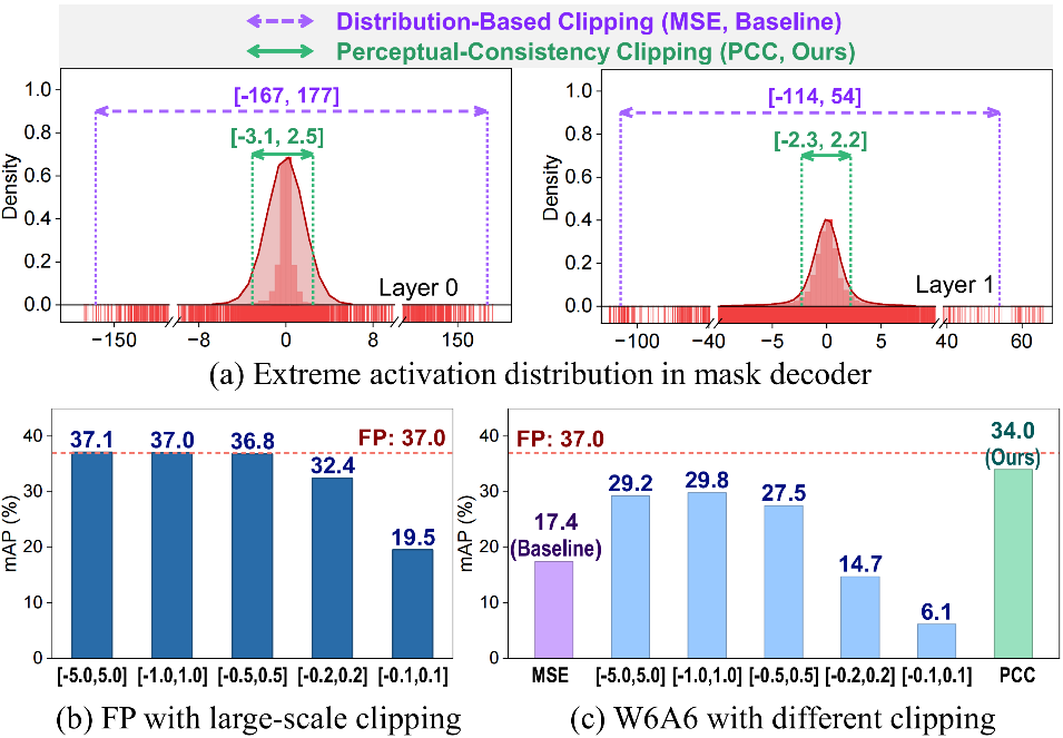 图1.掩码解码器中极端激活分布的可视化及不同剪裁方法的性能对比。掩码解码器中的 QK 激活值呈现出高度偏斜的分布,大部分数据集中在一个狭窄的范围内,而异常值可能超出正常范围的180倍。MSE 提供了一个过于宽泛的剪裁范围,而本文提出的感知一致性剪裁(PCC)方法能够更精确地识别异常值。