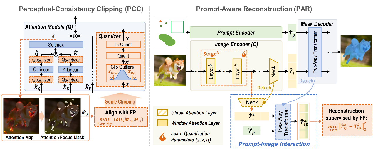 图2. SAQ-SAM框架。感知一致性剪裁(Perceptual-Consistency Clipping,PCC) 通过最小化注意力焦点相对于全精度模型的偏差,指导 QK 激活值的量化剪裁,从而在语义上保留感知对齐性。提示感知重建(Prompt-Aware Reconstruction,PAR)利用掩码解码器中的现成模块,将图像与提示的交互融入到逐Stage重建中。通过在全精度模型的监督下最小化交互响应误差,量化模型学习到视觉特征与提示意图之间的对应关系,从而在分布和语义层面实现双重对齐。