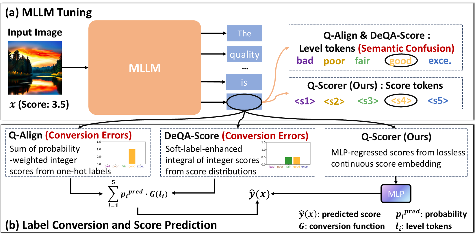 为解决上述问题,我们首先对以往方法中固有的误差进行了理论分析,并基于此提出了一个简单而高效的框架——Q-Scorer。该框架在 MLLM 流程中引入了轻量级回归模块与专为 IQA 设计的评分 token。大量实验证明,Q-Scorer 在多个 IQA 基准上均取得了最新的性能表现,能够良好地泛化到混合数据集上,并且在与其他方法结合时能进一步提升效果。
