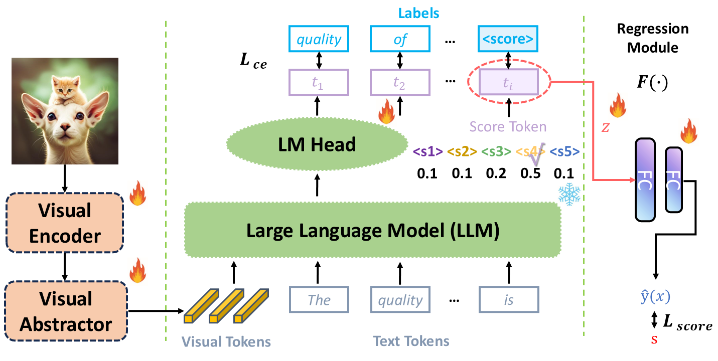 学习输出特定区间的评分 token。随后,将该评分 token 的嵌入向量输入至一个 MLP 中,以回归得到连续的质量分数,并利用