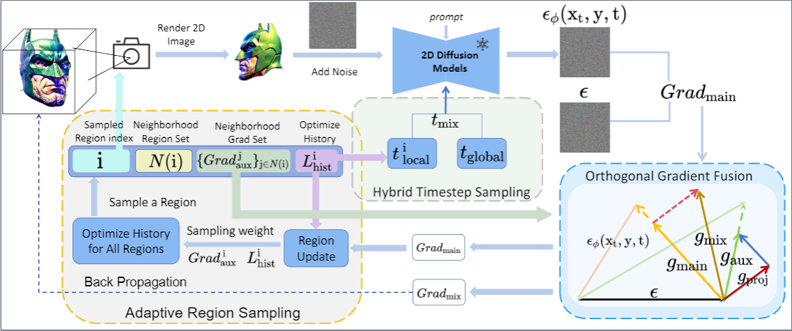 分数蒸馏采样推动了文本到3D生成的进展,但现有方法常难以生成细节丰富且多视图一致的3D资产。这些局限性源于对精细细节的引导不均、对单视图优化的过度依赖,以及扩散时间步和相机选择的过度随机性等问题,导致纹理模糊和视图不一致,降低了真实感。为了应对这些挑战,我们提出了CoGrad3D,这是一个统一的生成式精炼框架,它采用了一种持续自适应的优化策略。CoGrad3D 通过根据实时收敛信号动态调整优化焦点,确保了在几何完整性和高保真细节两方面都能取得均衡进展。具体而言,我们提出了一种自适应区域采样策略,该策略重点关注欠收敛的视图区域,从而促进稳定和均匀的优化。为了促进从粗糙几何到精细重建的过渡,我们开发了一种区域感知的时间调度方案,该方案将全局训练动态与局部收敛反馈相结合。此外,我们引入了一种梯度融合机制,该机制整合了来自相邻视角的历史梯度,从而减轻了特定视图的伪影,并促进了连贯3D结构的生成。